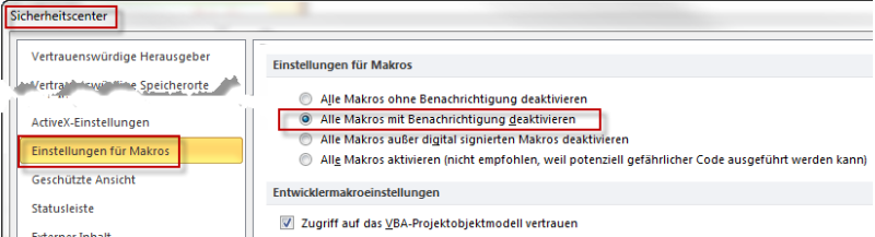 Steht diese Einstellung auf "Alle Makros ohne Benachrichtigung deaktivieren" (Bis Excel 2003 : "hoch"), so erscheint dieser Hinweis nicht und die Mappe funktioniert nicht ordnungsgemäß ! Stellen Sie also bitte sicher, dass diese Einstellung entsprechend der o.g. Vorgabe konfiguriert ist !