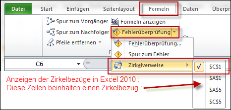 Zellen, die einen Zirkelbezug enthalten, können per "Formeln ⇨ Fehlerüberprüfung ⇨ Zirkelverweise" angezeigt werden : Zirkelbezüge sollten daher dringend vermieden werden, wenn diese nicht unbedingt und gezielt eingesetzt werden sollen. Mehr zur gezielten Verwendung von Zirkelbezügen erfahren Sie im Abschnitt über Iterationen. (Fortsetzung folgt...irgendwann... ;-)